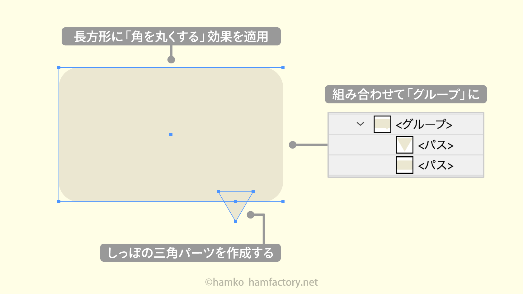 長方形の辺に合わせてしっぽのパーツを自由に動かせるようになるだけでなく、パス上オブジェクトとして全体がひとつにまとまり、扱いやすくなるメリットもあります。