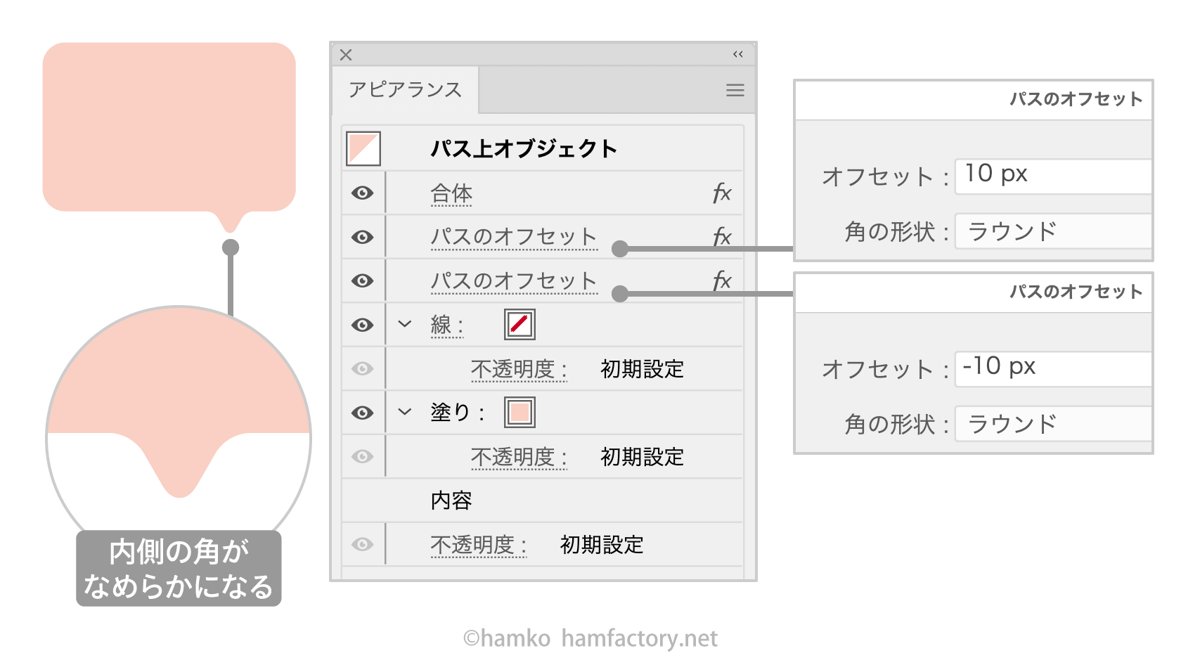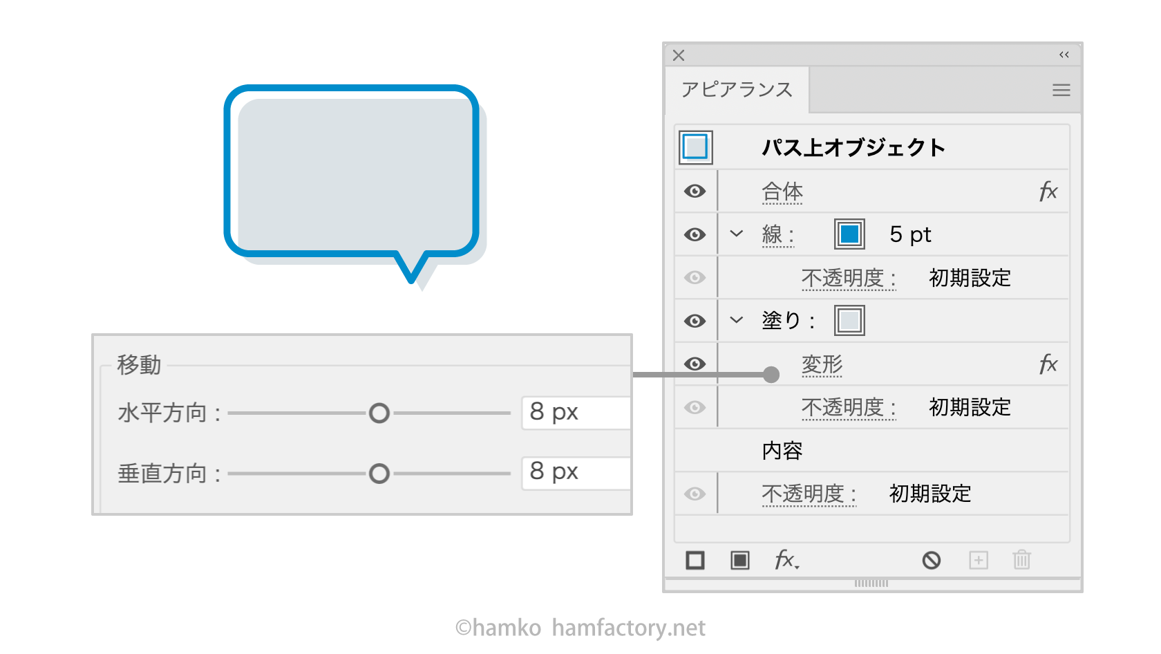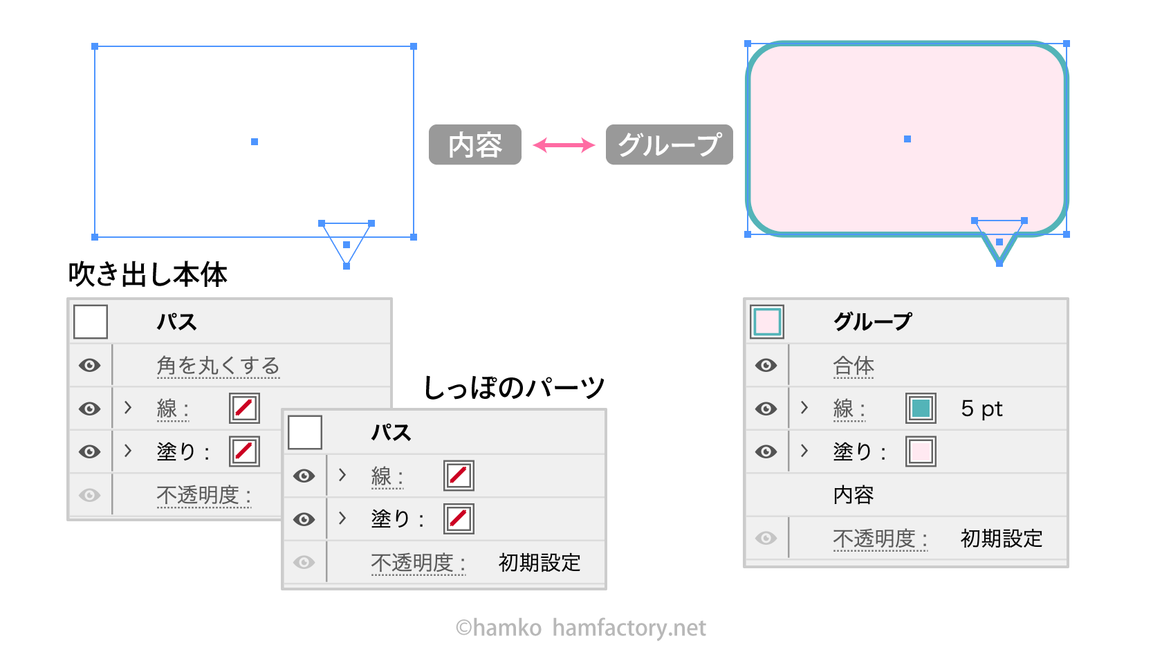 この作り方なら吹き出しのグループを選択して「アピアランス」パネルを見たときに一目で構造がわかり、編集しやすい状態になります。
