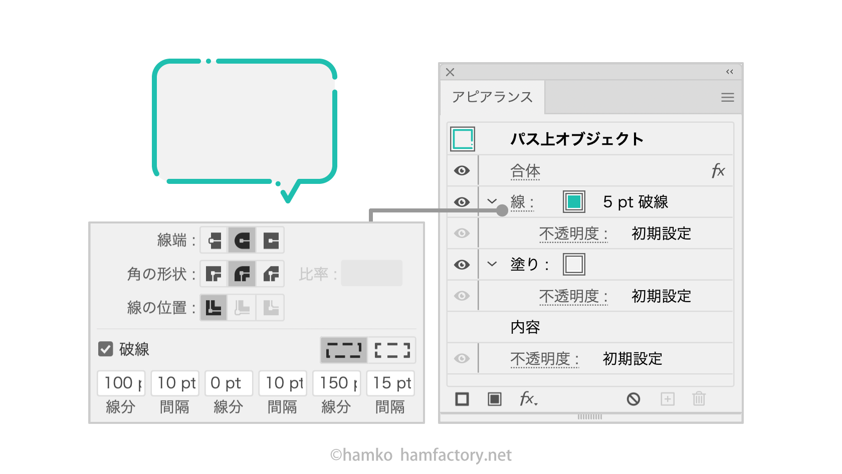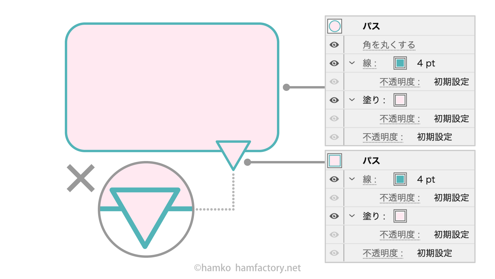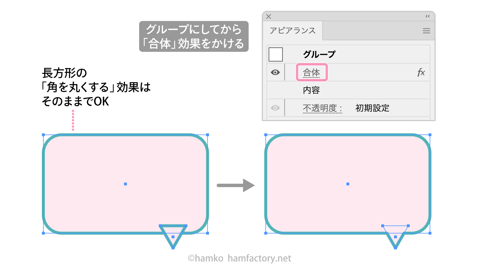 この作り方なら吹き出しのグループを選択して「アピアランス」パネルを見たときに一目で構造がわかり、編集しやすい状態になります。
