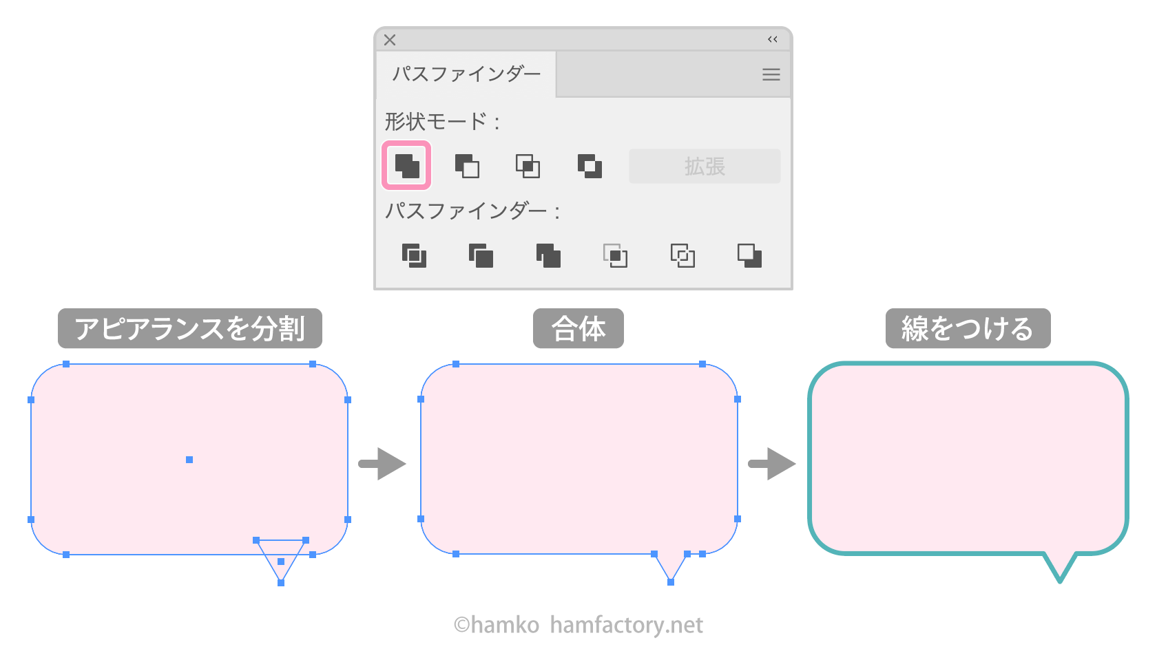 また、吹き出し全体にフチを付けるならパス上オブジェクトに「合体」効果をかければ作成できます。