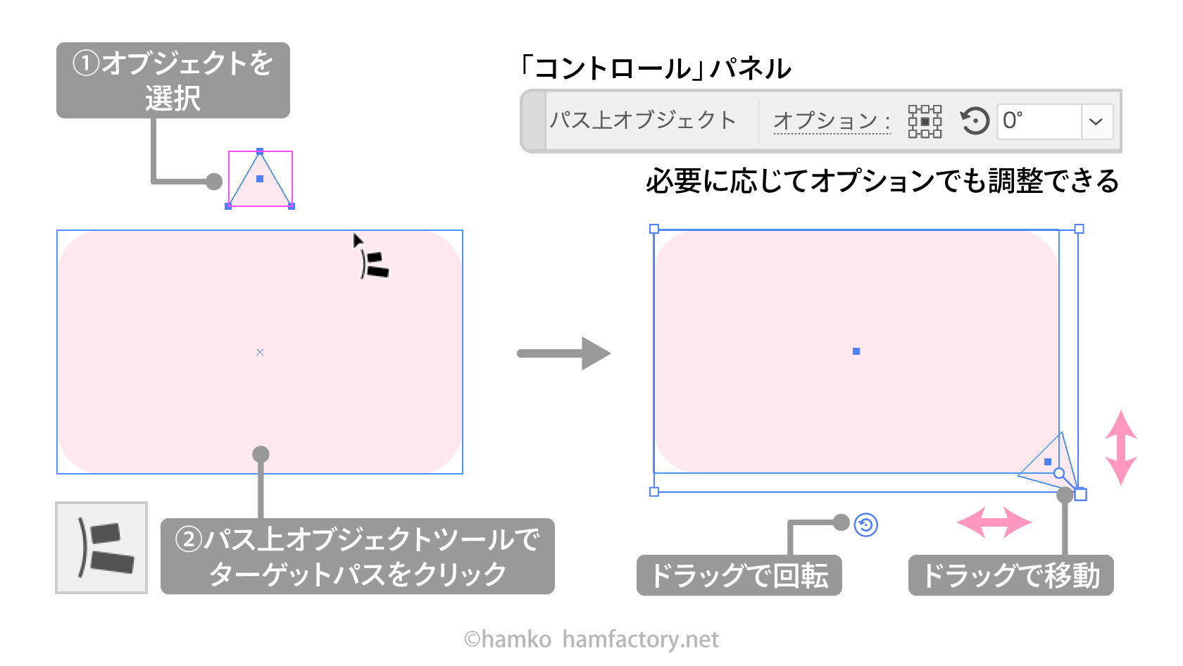 今回の吹き出しの場合は、しっぽの三角形を選択してから「パス上オブジェクトツール」に切り替え、吹き出し本体の長方形(ターゲットパス)をクリックするだけです。