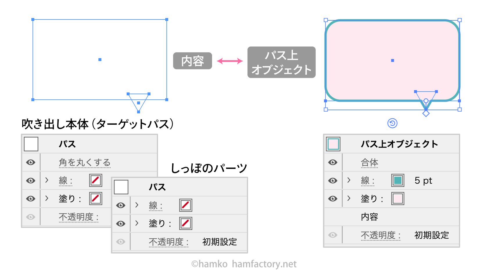 例えば、吹き出しの長方形には「角を丸くする」効果をかけたままでパス上オブジェクトを作成できます。パス上オブジェクトに変換しても効果は保たれるため、後から何度でも角丸の半径を変えられます。
