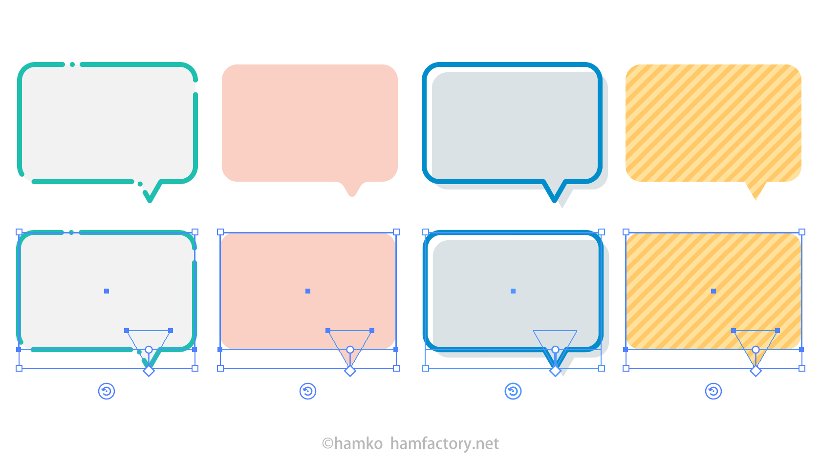 ここまで解説で使った「角を丸くする」効果をかけた長方形と三角形の組み合わせを元に、パス上オブジェクトを作ってさらに効果で装飾しています。いずれも、大きさやしっぽの位置の調整などが再編集しやすい吹き出しになっています。
