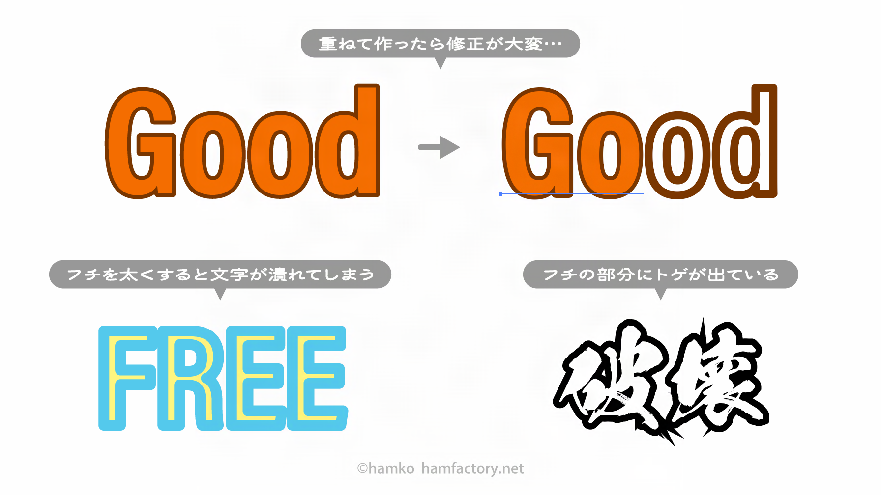 今回はフォローアップとして、フチ文字作成でよくあるトラブルとその対策について少し掘り下げてみます。