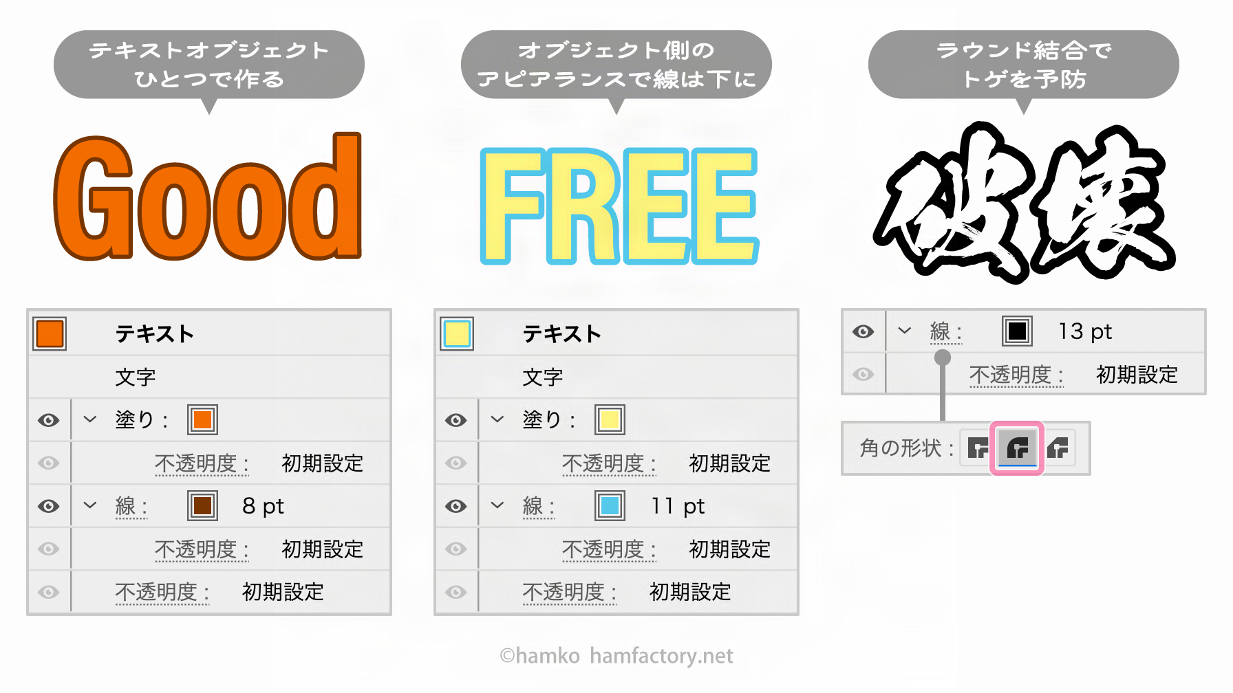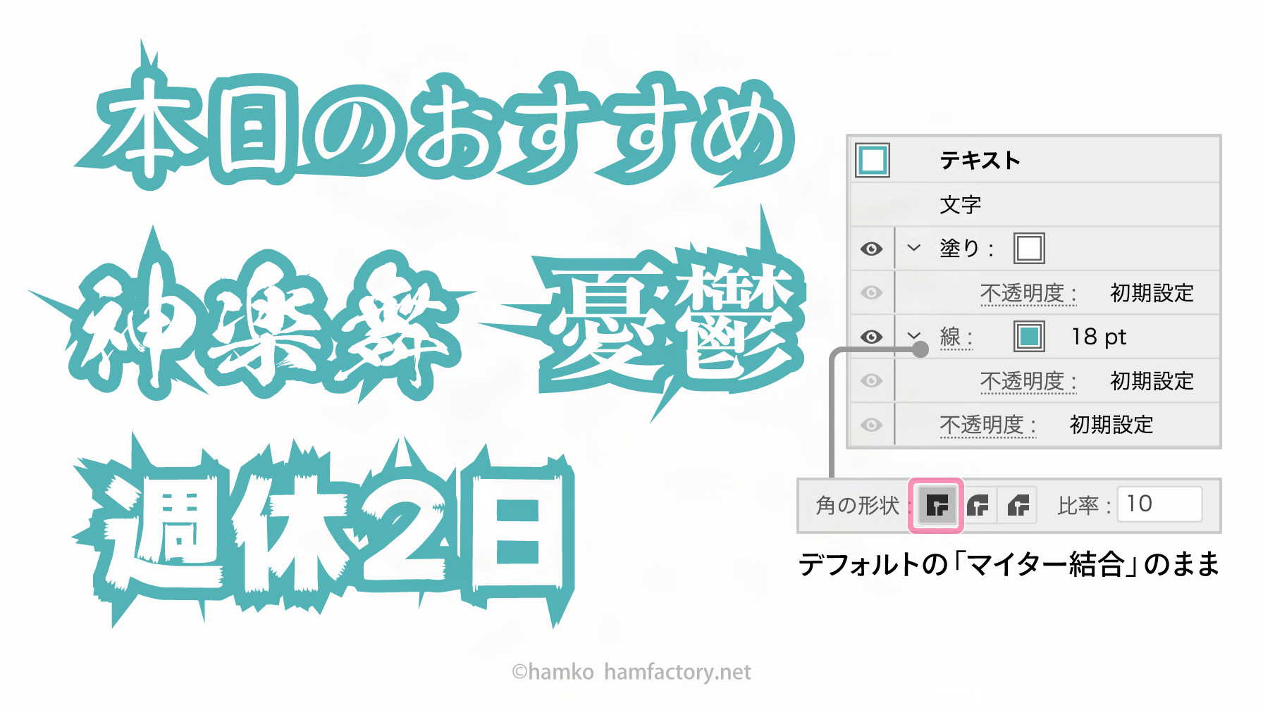 テキストに対して線でフチをつける時、「線」パネルのデフォルト設定「角の形状:マイター結合」では、文字のかたちや線幅によってトゲがついたような見た目になってしまいます。
