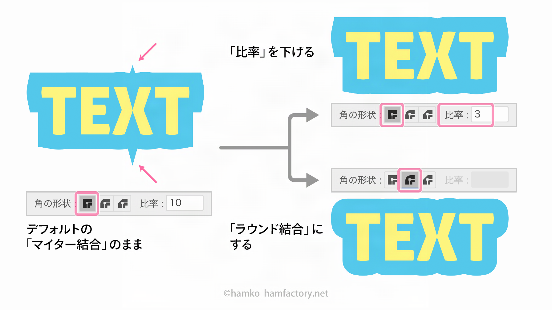 シャープな印象を演出したいケースでは「比率」を調整しながら「マイター結合」を使うこともありますが、特に事情がなければ「ラウンド結合」へ変更するのがおすすめです。