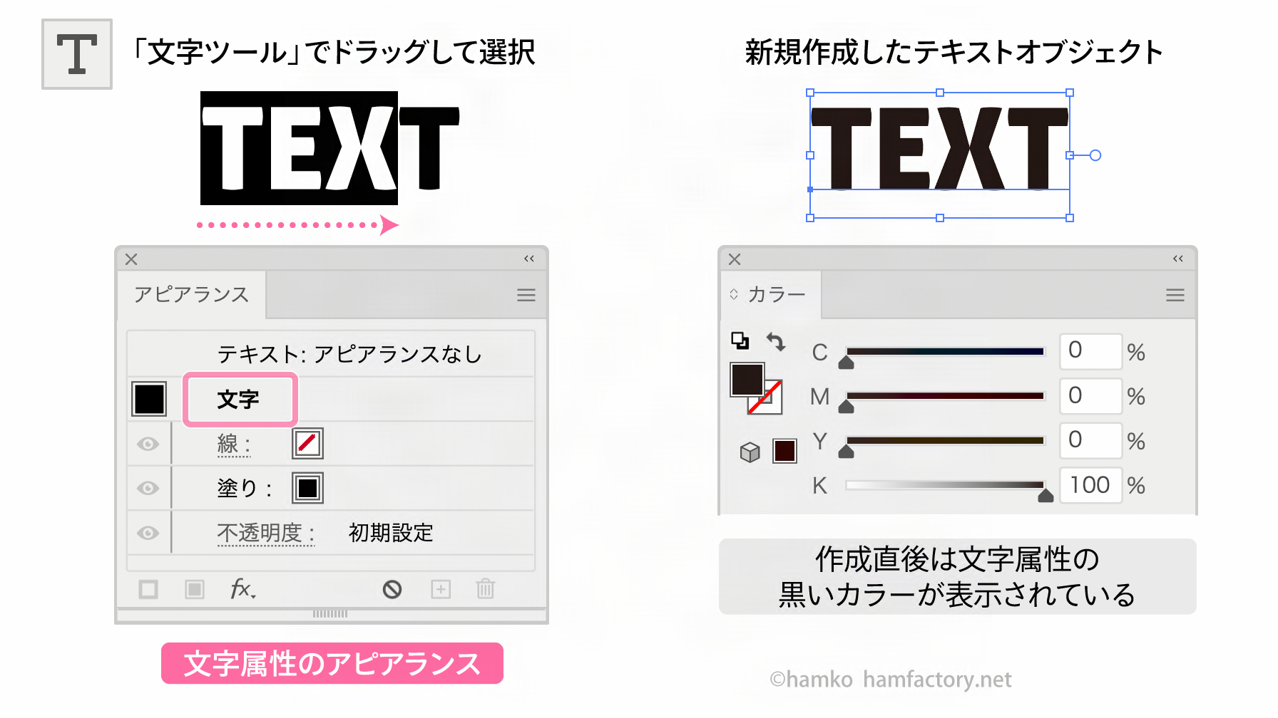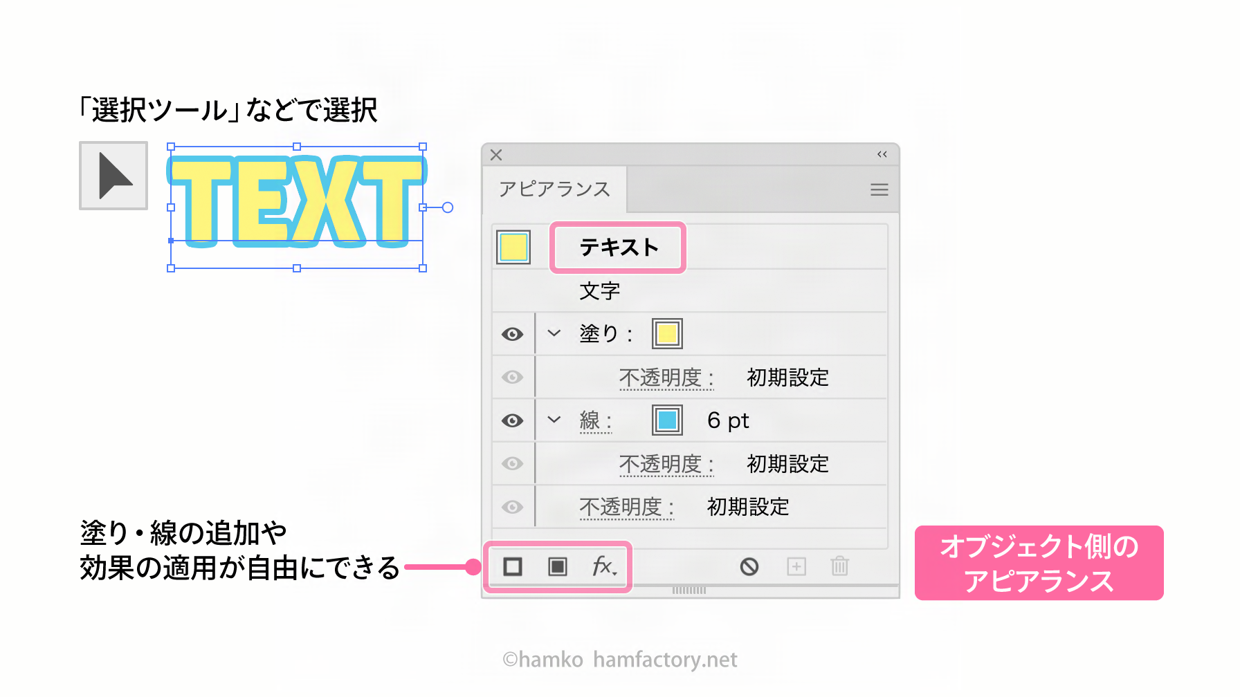 対して、「選択ツール」などでテキストを選んだときに「アピアランス」パネルに表示される情報は「オブジェクト側のアピアランス」と呼ばれています。