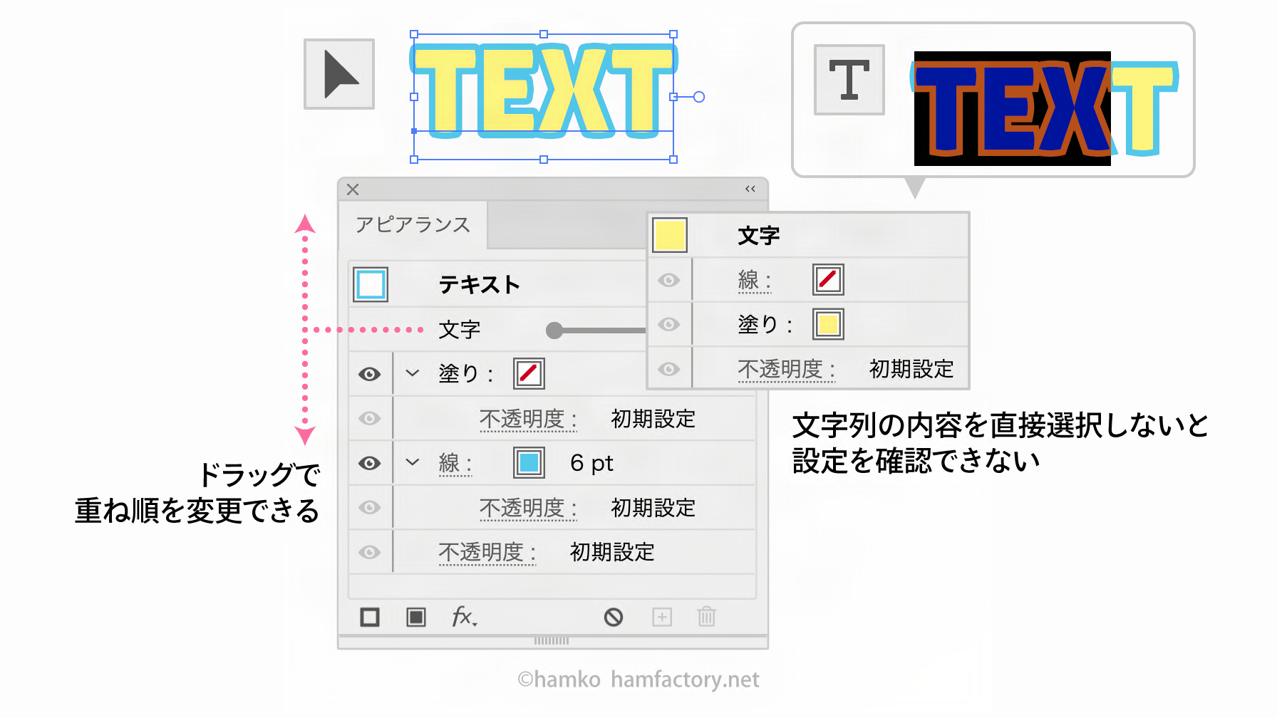 オブジェクト側のアピアランスにある「文字」という項目には文字属性のアピアランスが格納されていて、線や塗りなどの項目と同じようにドラッグで重ね順を変更できます。