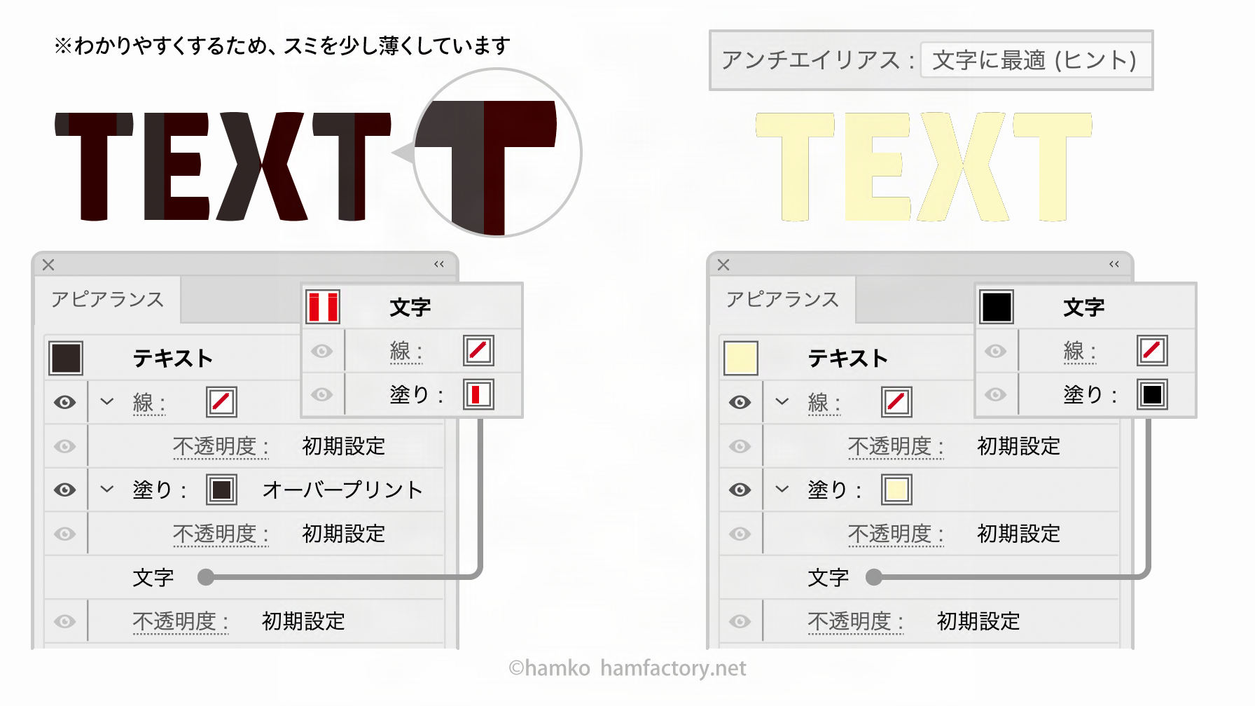 - 「アンチエイリアス:文字に最適(ヒント)」で画像を書き出すと、背面の「文字」のカラーがわずかにはみ出てきれいに仕上がらない